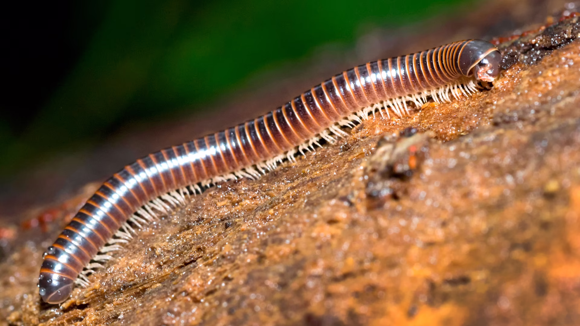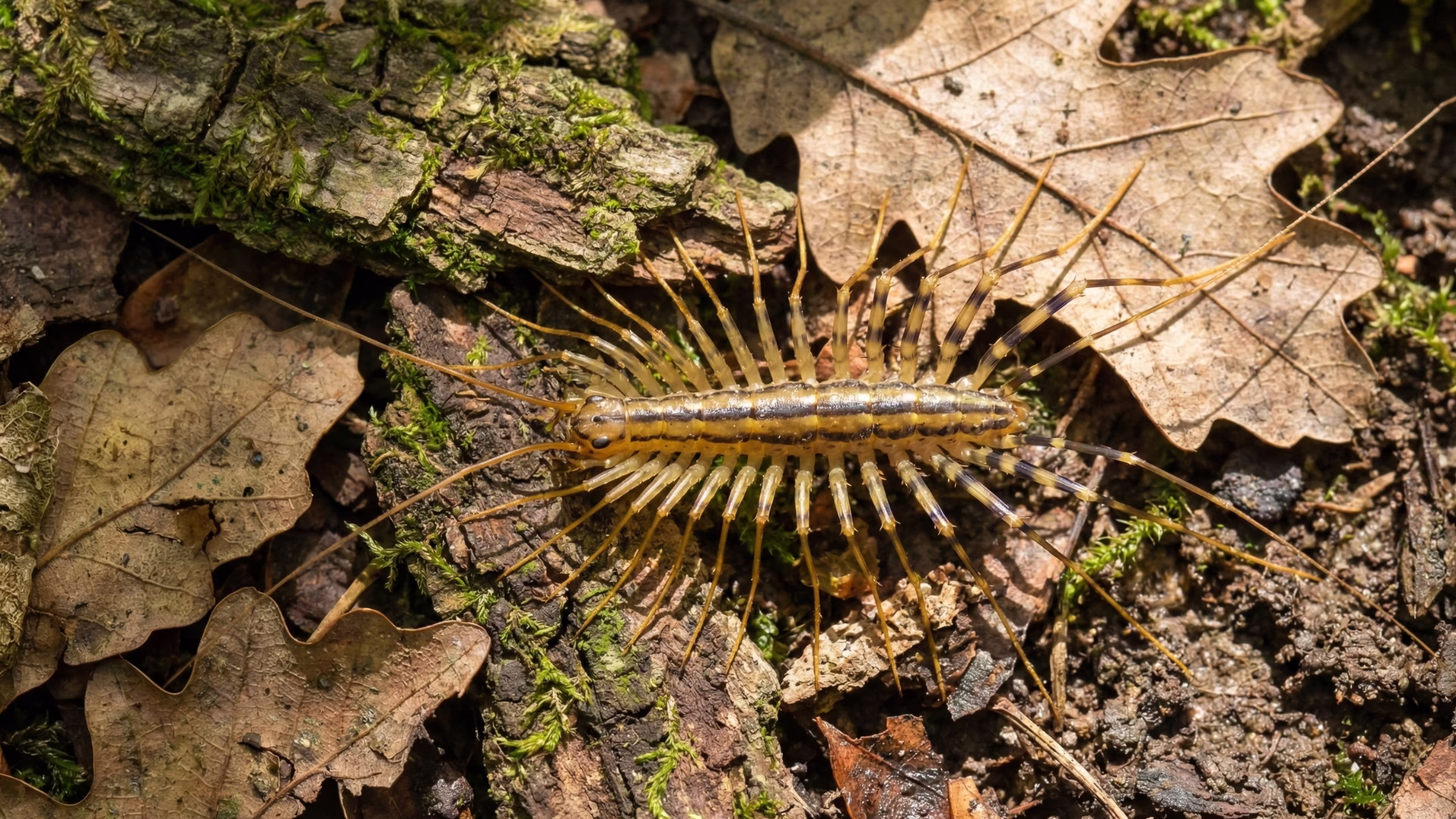 Easily recognized by its yellowish-gray, flattened body and its large number of very long, delicate legs that give it a fringed, fast-moving appearance.