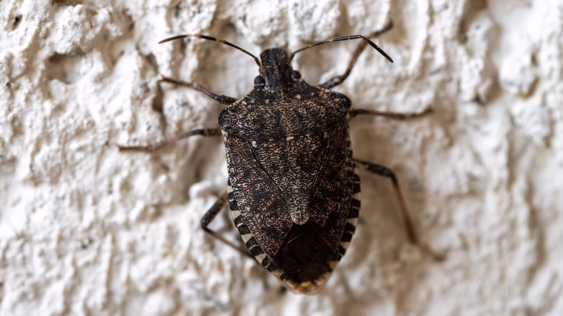 This broad, shield-shaped insect can be green or brown and emits a foul odor when disturbed.