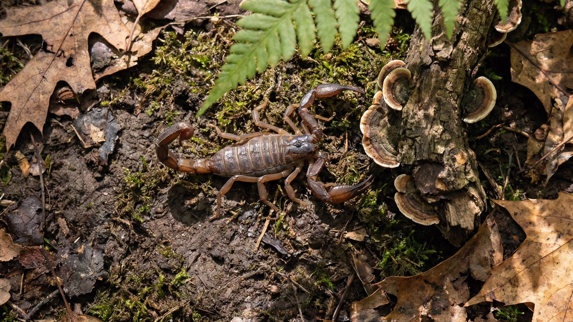 Scorpions are easily recognized by dark brown color, large pincers, and long tail with a stinger.